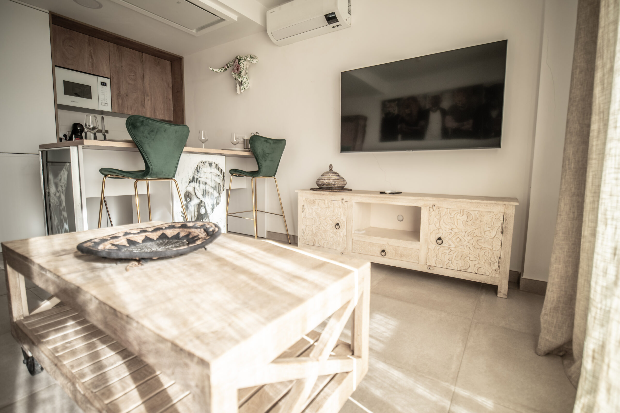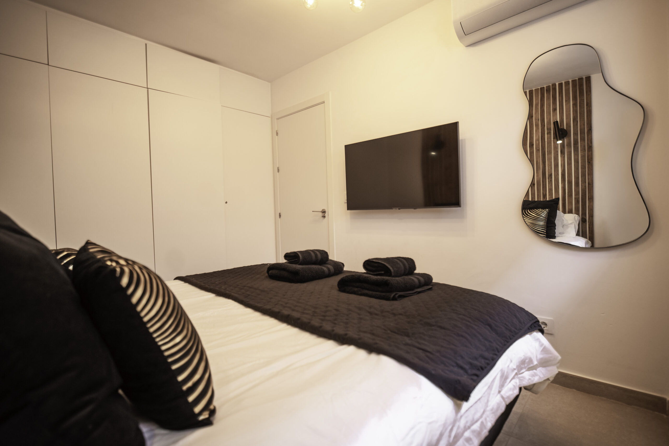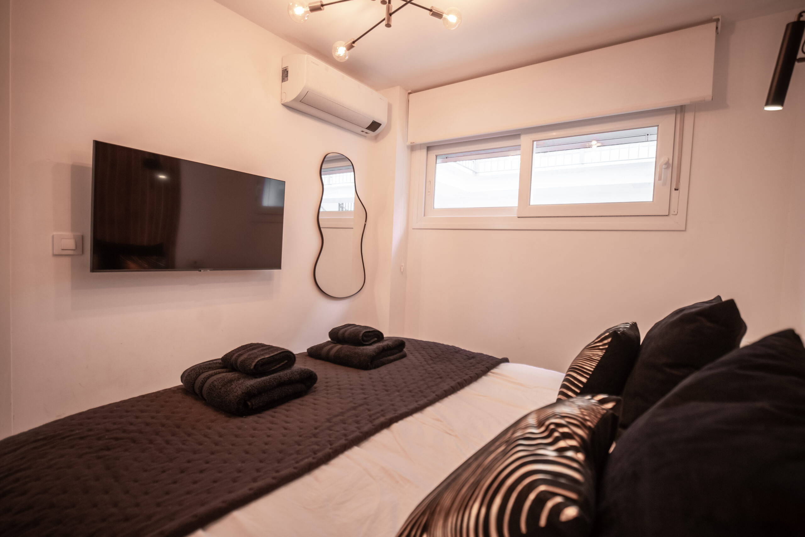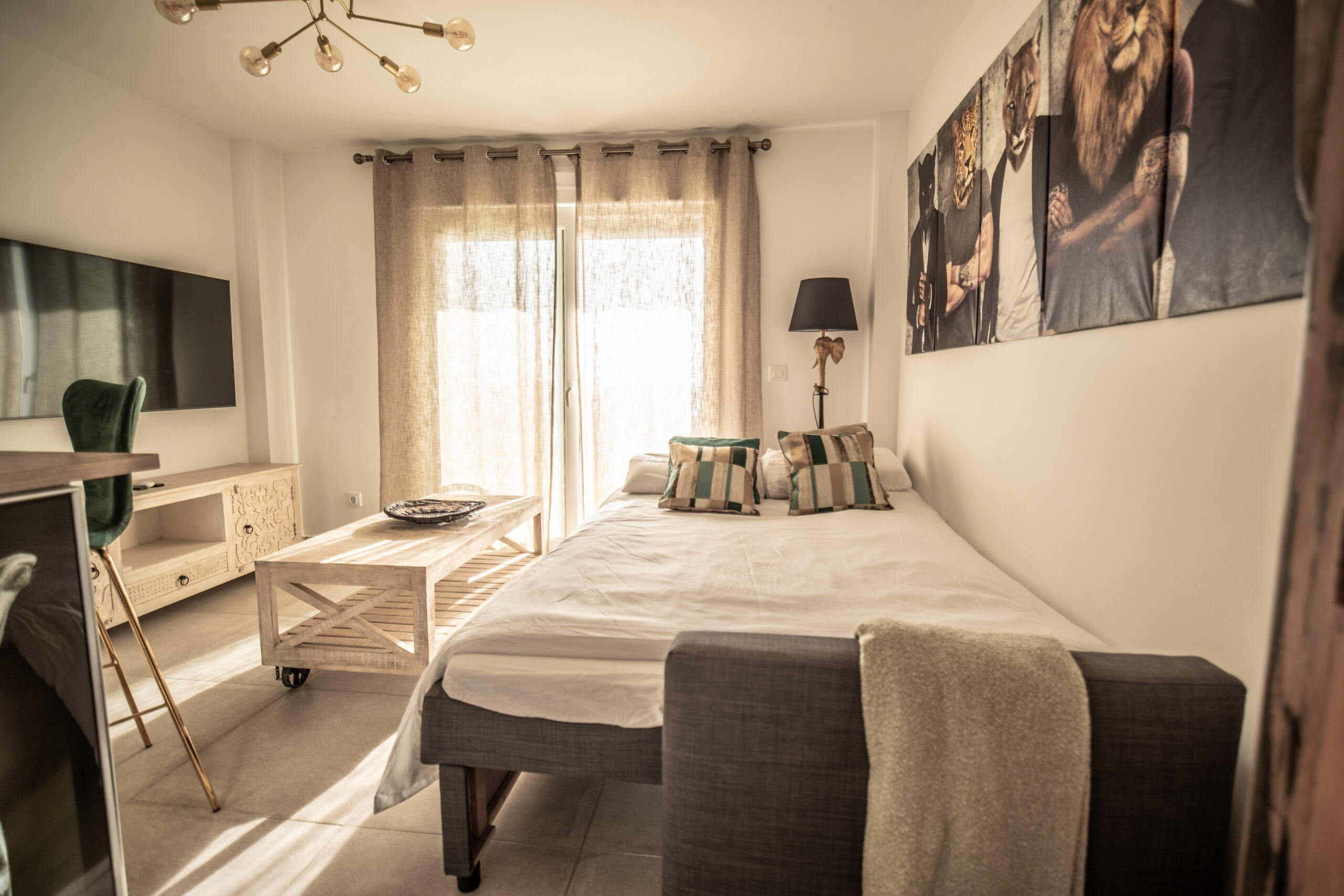 Cuenta con 1 habitación principal más salón reconvertido en otra habitación independiente con su puerta y su pestillo. Las dos estancias, salón y habitación , son completamente independientes. Cada una cuenta con cama de matrimonio, armario, TV con Smart TV , aire acondicionado/calefacción, cafetera, minibar en dormitorio y cocina completa con frigorífico en otra. Decorado por la empresa Kvinteriorismo.