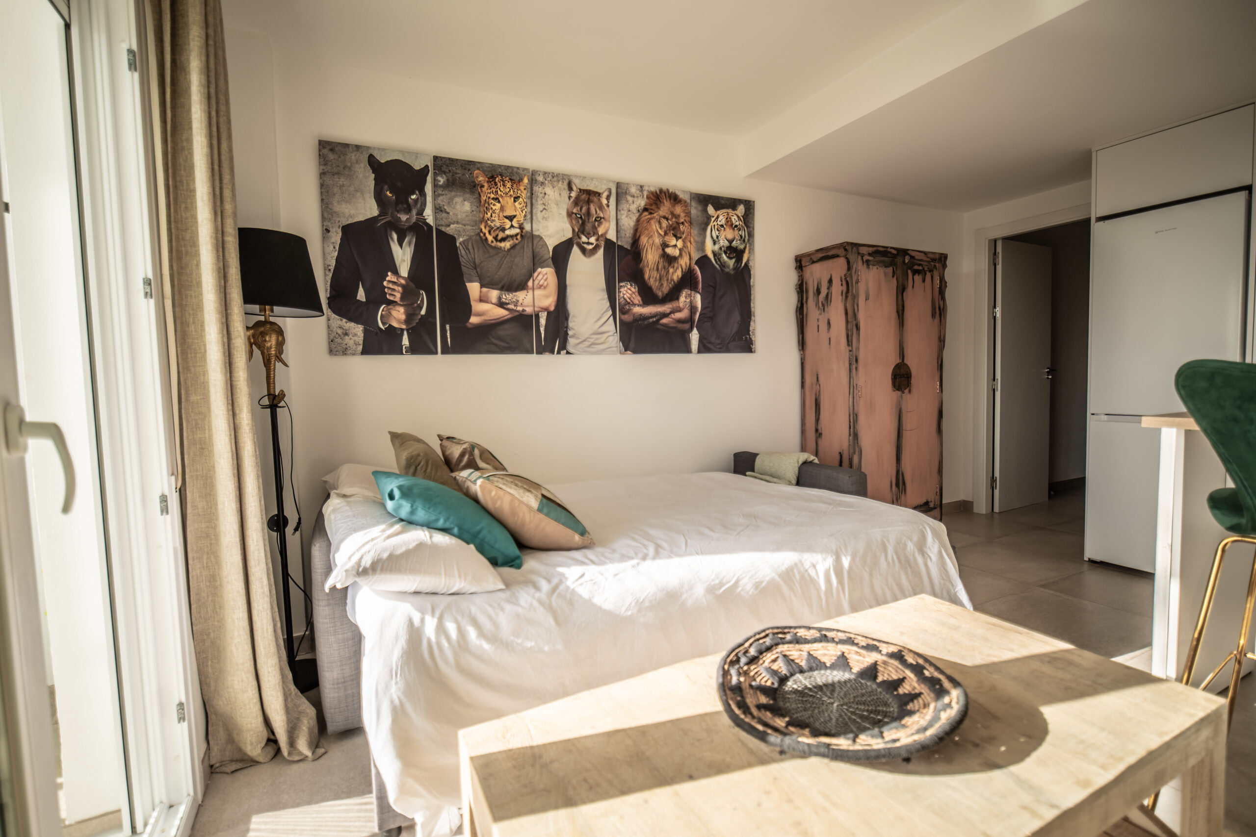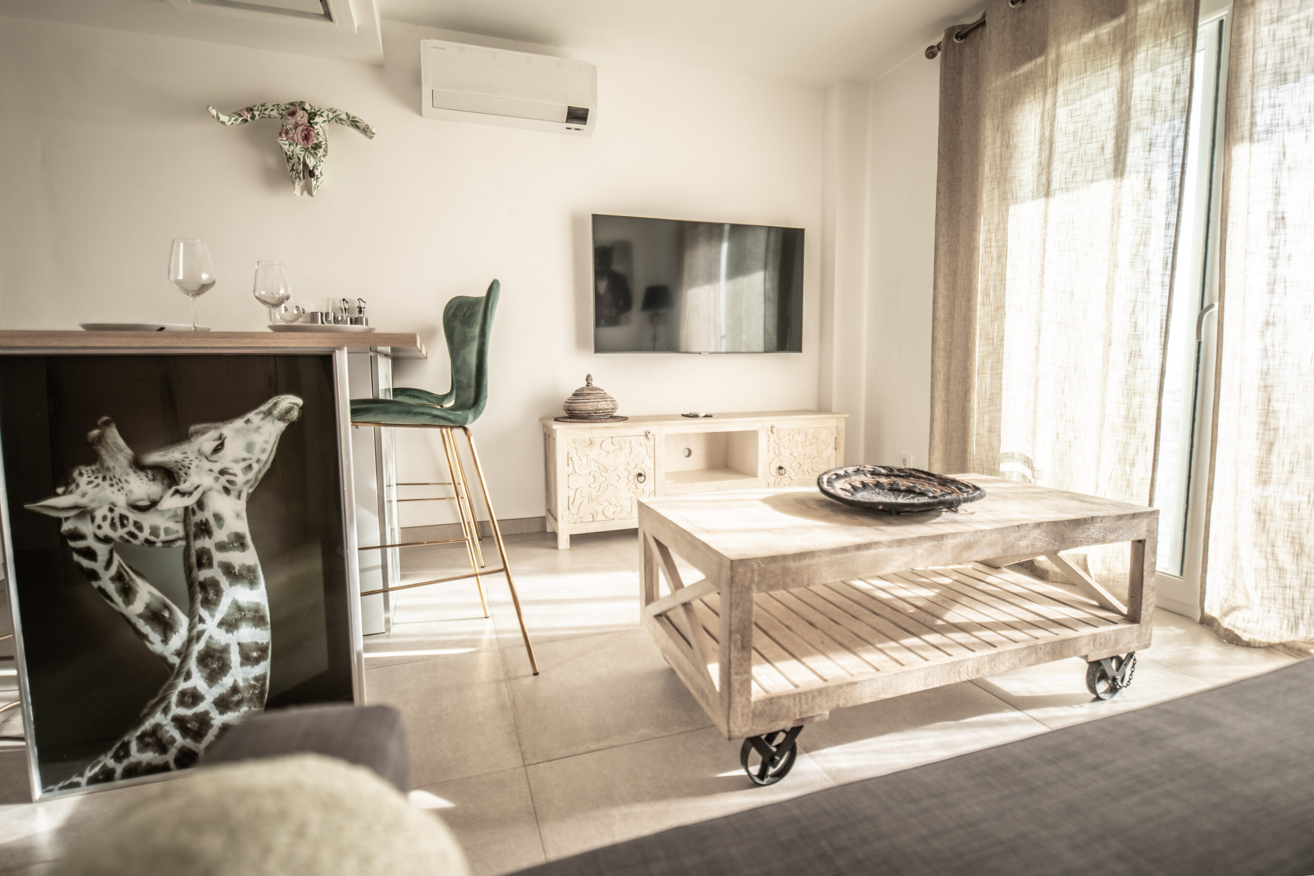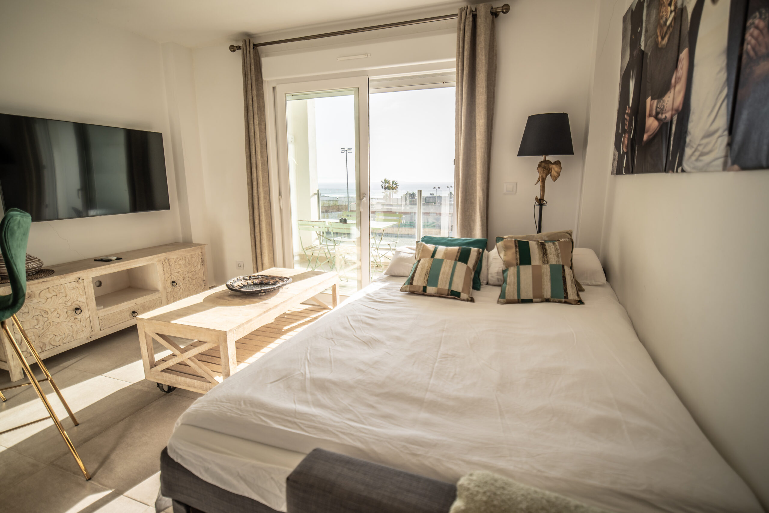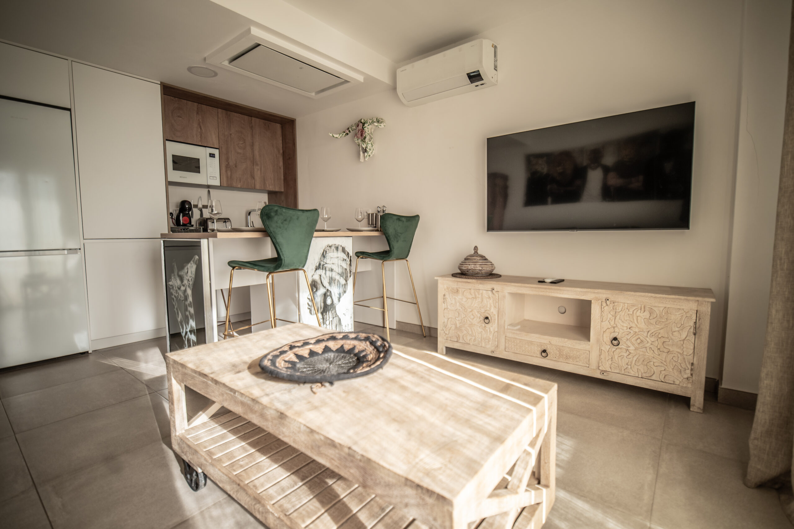 Cuenta con 1 habitación principal más salón reconvertido en otra habitación independiente con su puerta y su pestillo. Las dos estancias, salón y habitación , son completamente independientes. Cada una cuenta con cama de matrimonio, armario, TV con Smart TV , aire acondicionado/calefacción, cafetera, minibar en dormitorio y cocina completa con frigorífico en otra. Decorado por la empresa Kvinteriorismo.