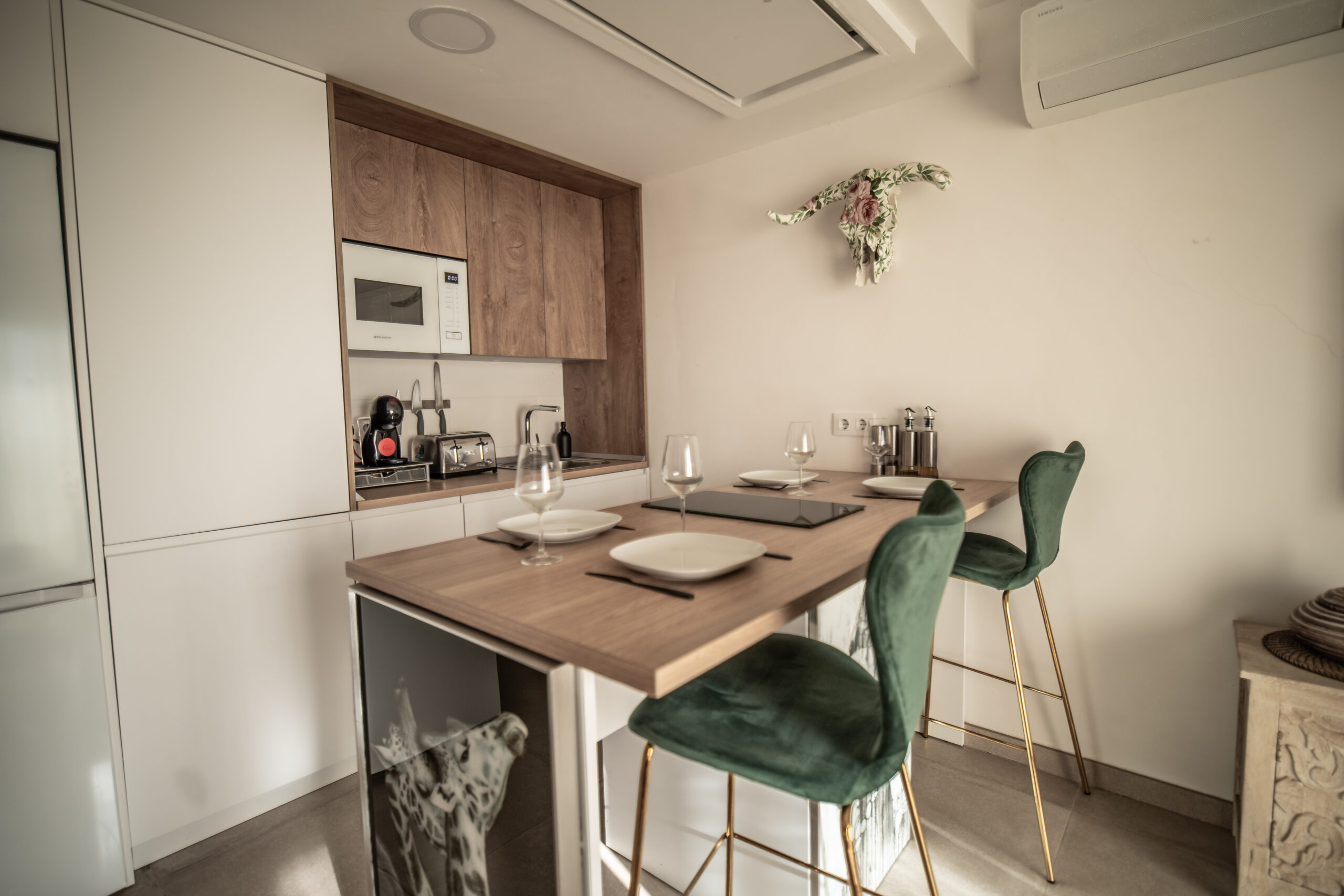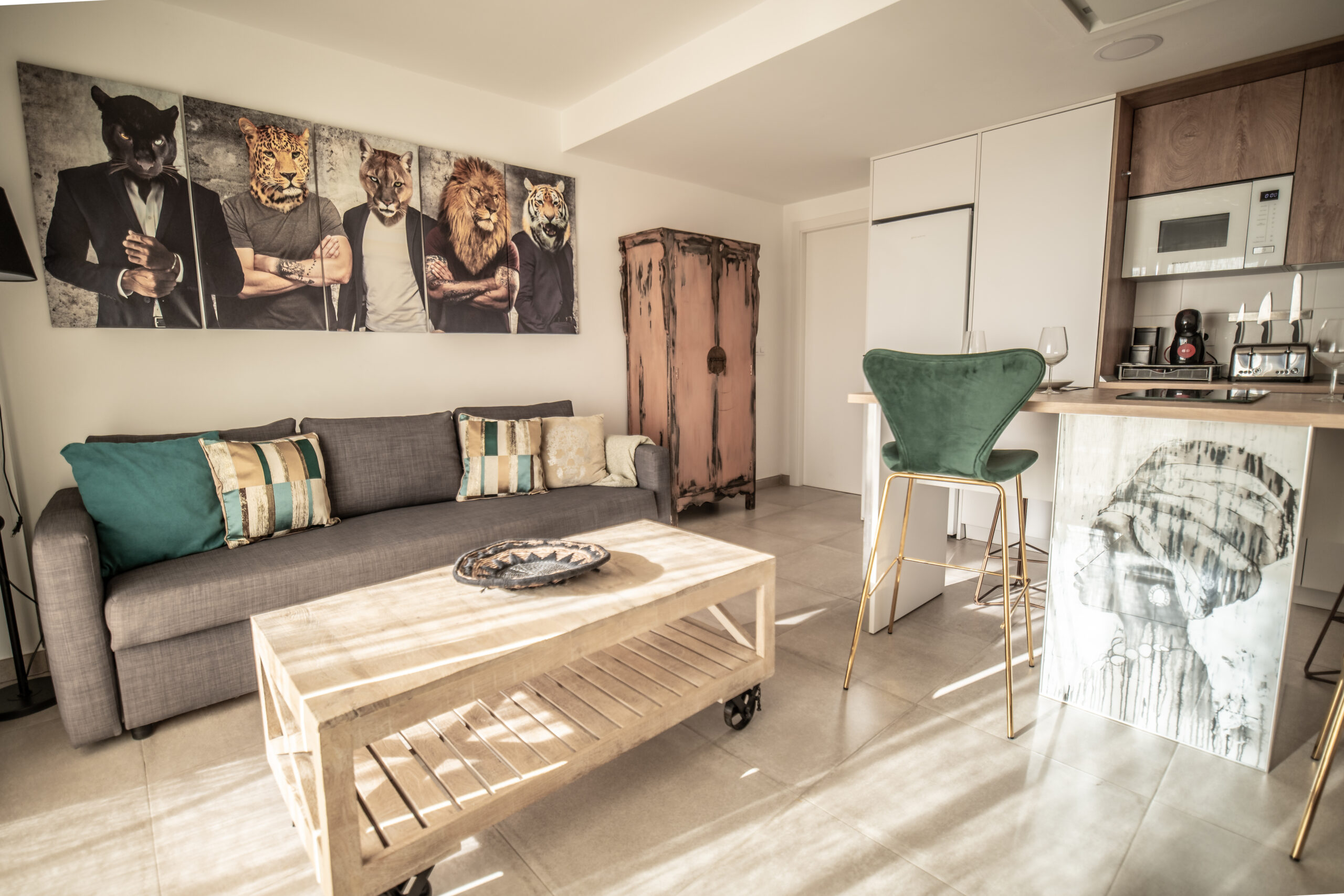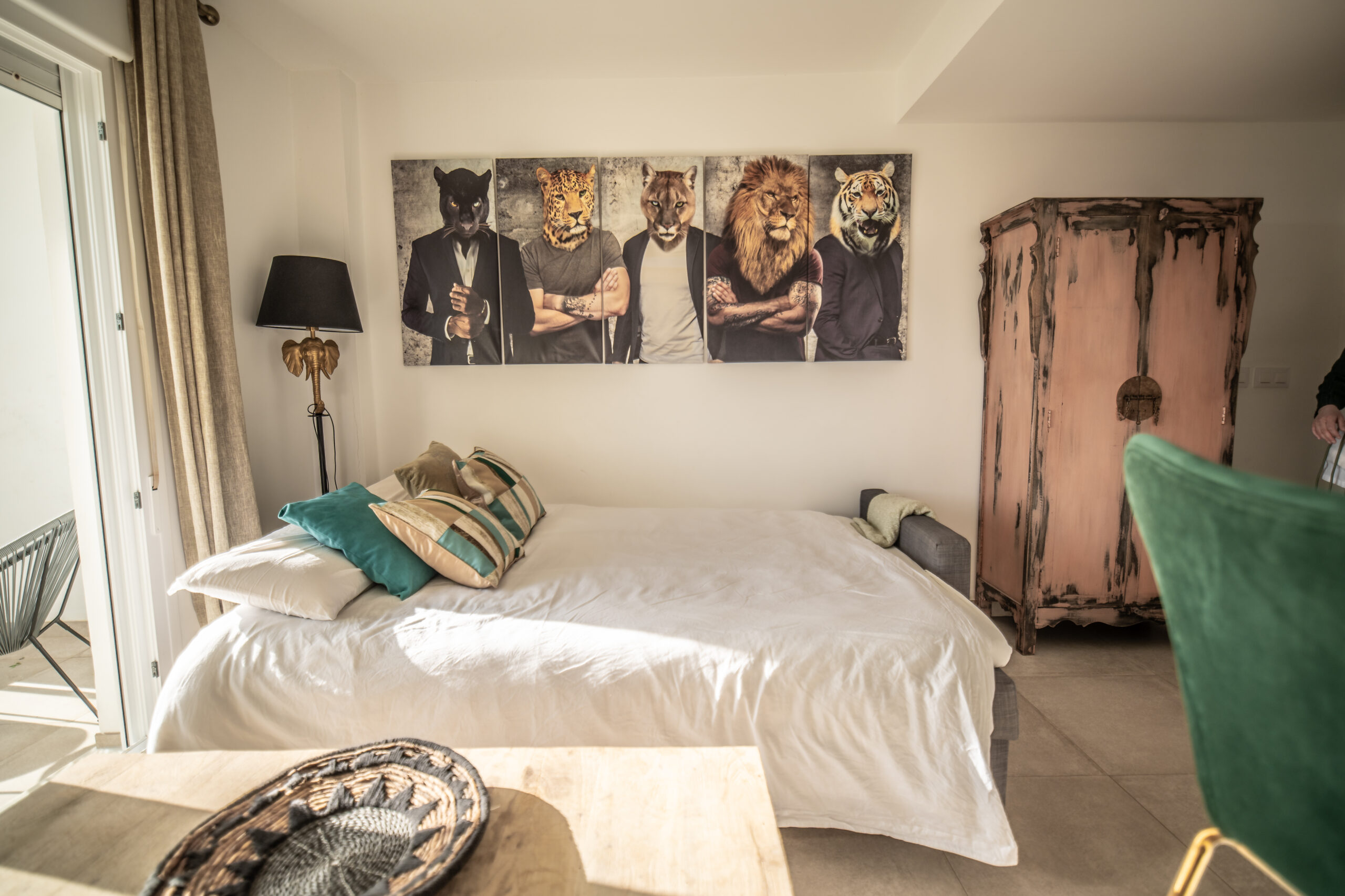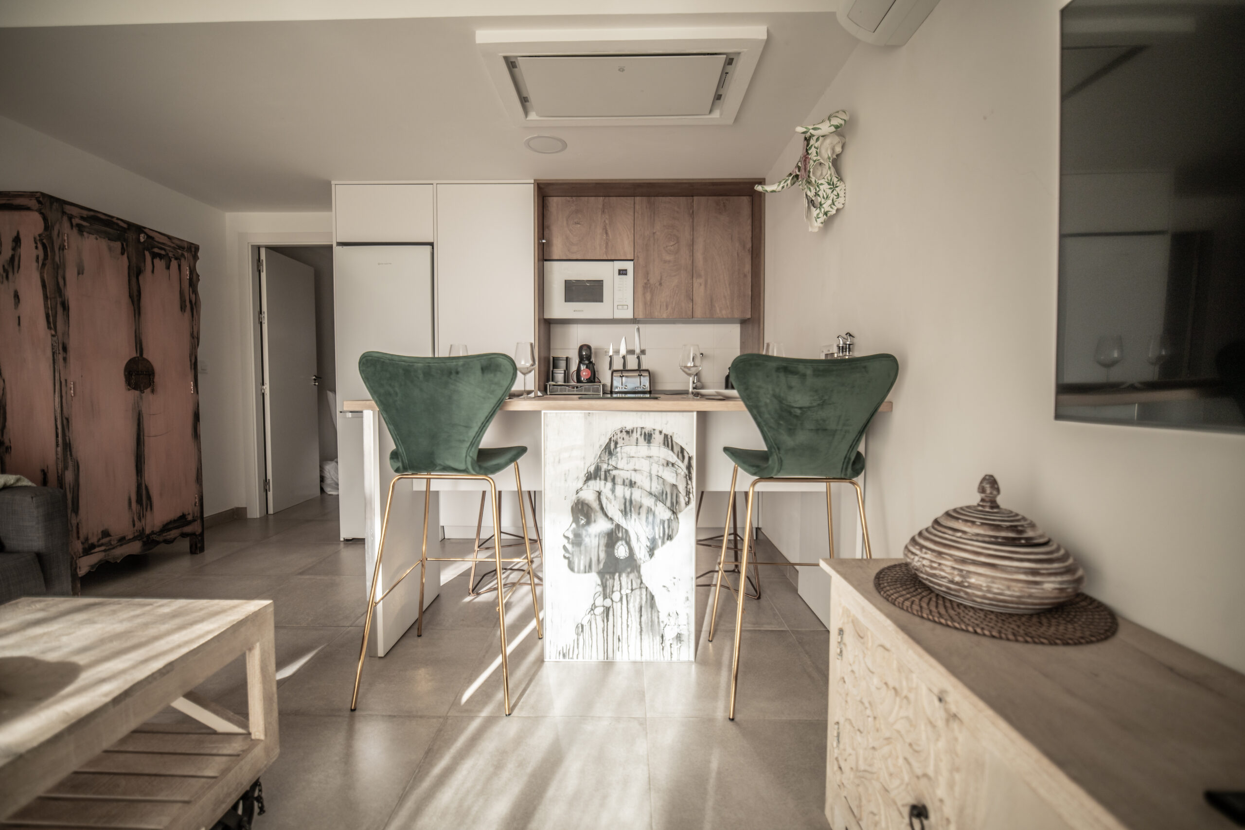 Cuenta con 1 habitación principal más salón reconvertido en otra habitación independiente con su puerta y su pestillo. Las dos estancias, salón y habitación , son completamente independientes. Cada una cuenta con cama de matrimonio, armario, TV con Smart TV , aire acondicionado/calefacción, cafetera, minibar en dormitorio y cocina completa con frigorífico en otra. Decorado por la empresa Kvinteriorismo.