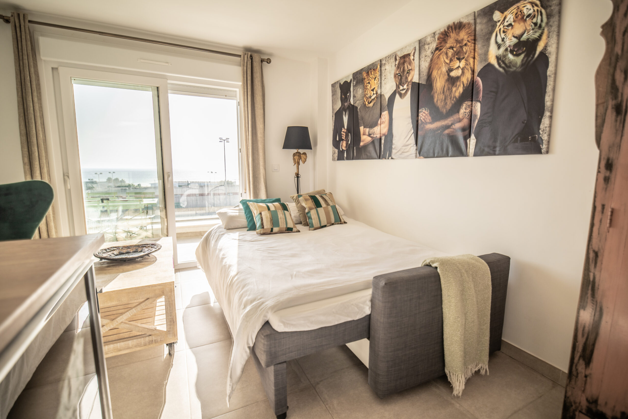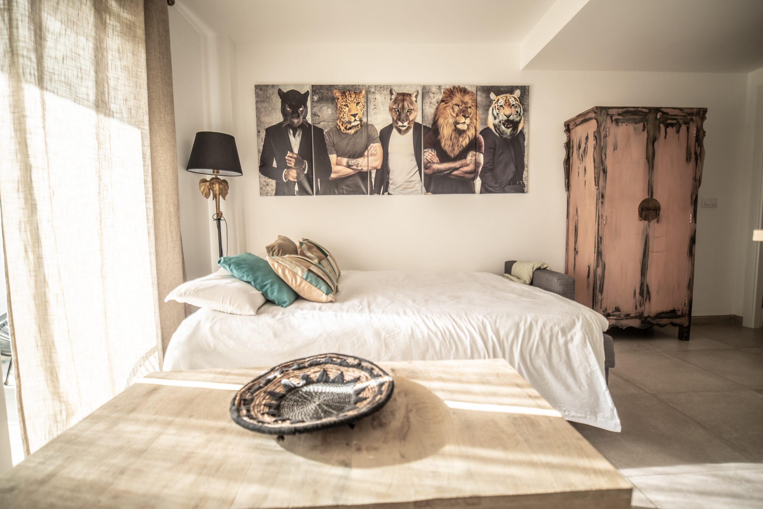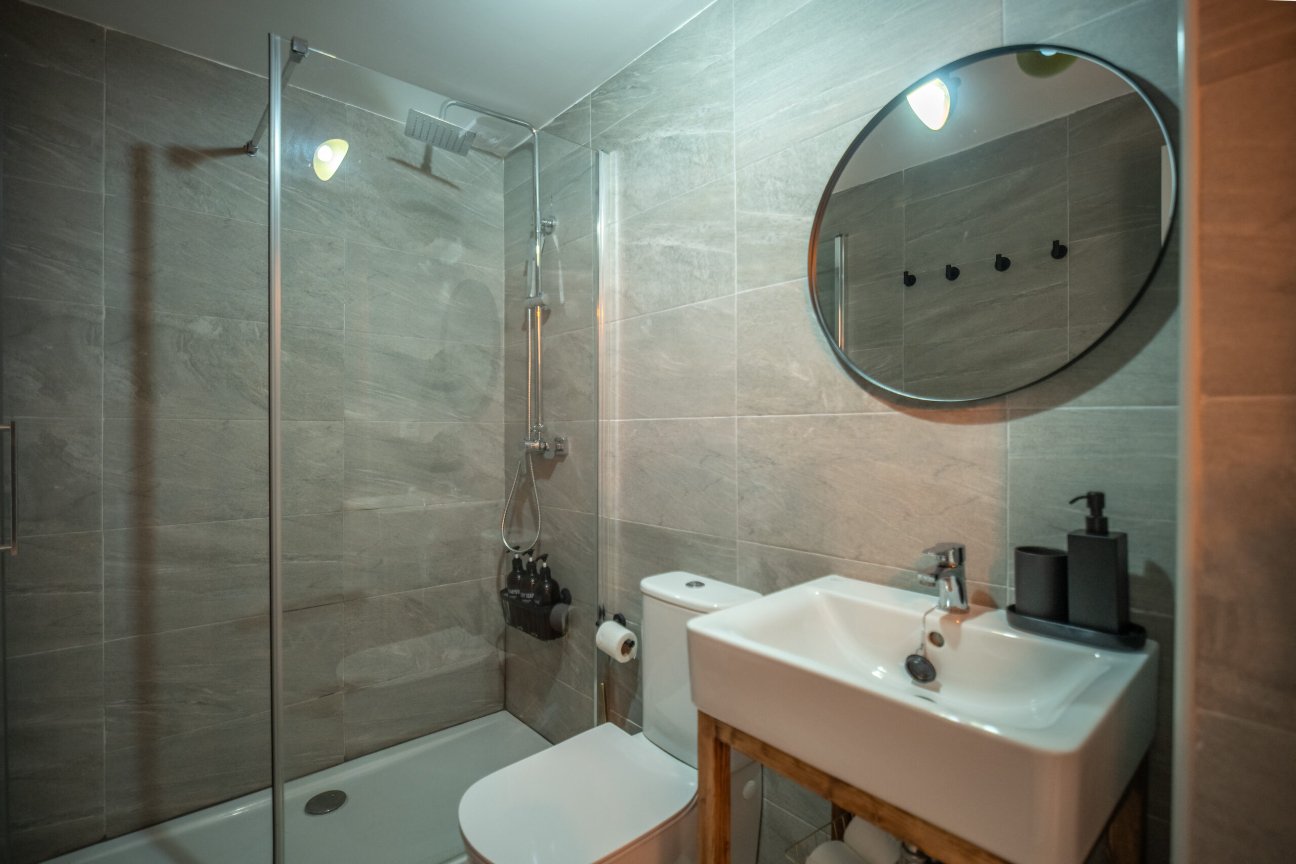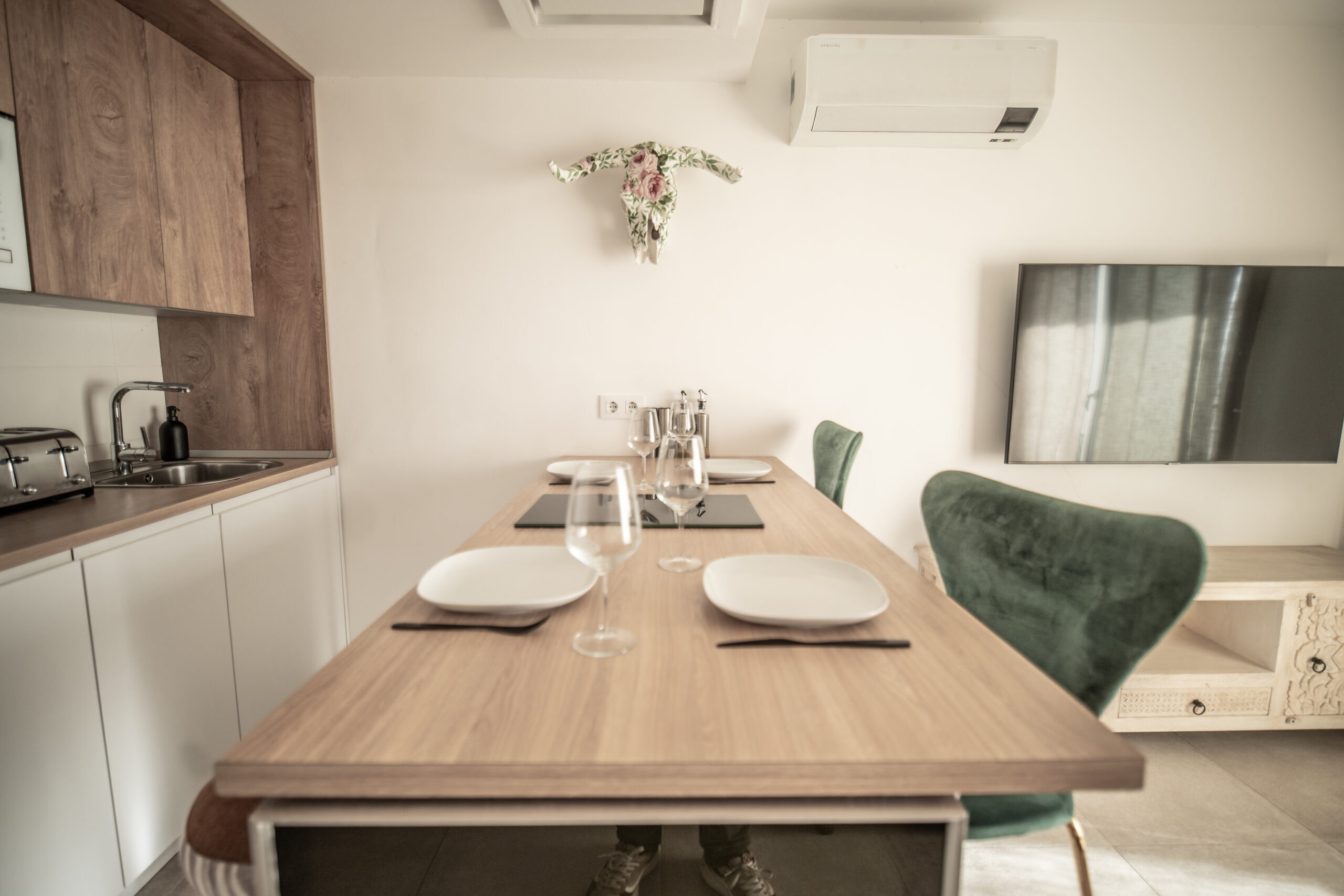Cuenta con 1 habitación principal más salón reconvertido en otra habitación independiente con su puerta y su pestillo. Las dos estancias, salón y habitación , son completamente independientes. Cada una cuenta con cama de matrimonio, armario, TV con Smart TV , aire acondicionado/calefacción, cafetera, minibar en dormitorio y cocina completa con frigorífico en otra. Decorado por la empresa Kvinteriorismo.
